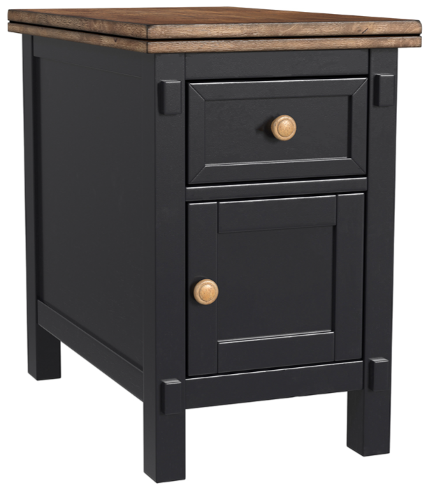 The Stormy Ridge Occasional group makes your family and guests feel right at home with it’s practical farmhouse style. Door fronts feature x-shaped detailing to enhance the hospitable warmth of this collection. Pronounced distressing in the chickory finish of the tops and drawer pulls that is contrasted by the soft, slate black finish.Read More