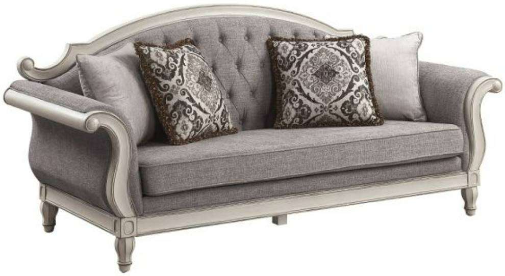 Rustic with a modern flare, the Florian sofa offers the best of both worlds. The gray fabric and antique white finish of this sofa create a harmonious design. The rolled arms and wooden trim add charm, while the classic button tufting creates visual depth.Read More