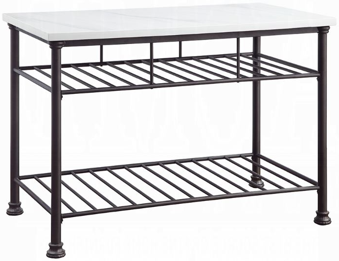 Minimalistic design paired with clean, simple color. The Freyja kitchen island gives off a light and airy feel to a compact cooking space. Clean-lined metal frame is topped with a artificial stone top, creating a sleek, modern silhouette that gives your kitchen an open feel.Read More