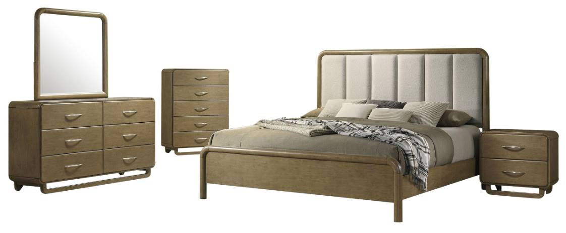 Transform your bedroom into a stylish and serene retreat with this modern bedroom set. The warm nutmeg wood finish across all pieces creates a cohesive and inviting atmosphere, while the soft, beige upholstered headboard on the bed adds a touch of luxury.Read More