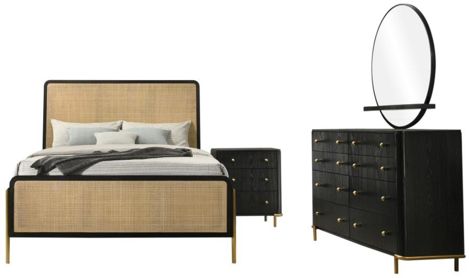 Woven rattan head and footboards create a bold focal point within this four-piece modern bedroom set that includes a nightstand, dresser, and mirror. Its rich black frame finish enhances each piece, offering a distinctive sense of structure that's perfectly augmented with soft, muted gold accents.Read More