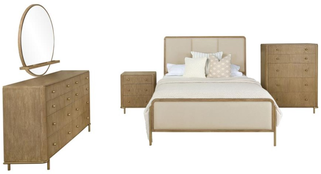 This coastal-inspired bedroom set blends mid-century modern influences with natural textures for a serene retreat. The bed features a cream fabric upholstered headboard and footboard, framed by a wire-brushed wood finish that enhances the beauty of rubberwood, engineered wood, and ash veneer. Aged brass knobs and slender metal legs provide a refined contrast.Read More
