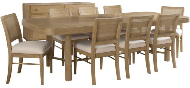 This dining set blends modern craftsmanship with natural textures for a refined yet inviting feel. The dining table features a trestle base with an antique brass-finished metal stretcher bar, adding stability and contrast. Rounded corners soften the rectangular top, while a removable 18-inch leaf allows for flexible seating.Read More
