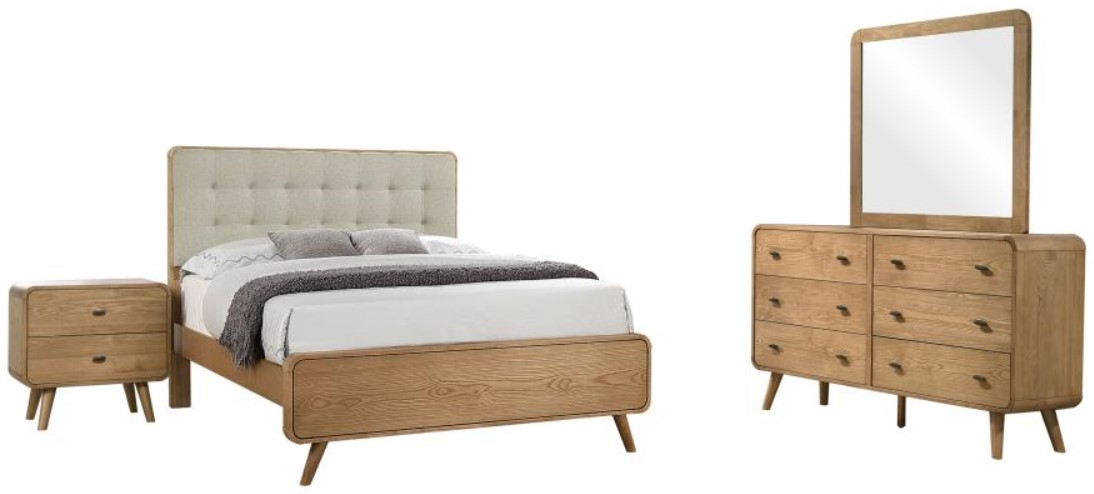 Transform your bedroom into the ultimate retreat with this mid-century modern bedroom set. Expertly crafted from rubberwood, engineered wood, and ash veneer, the set includes a bed, nightstand, dresser, mirror, and optional chest for a cohesive look. Rounded edges, tapered legs, and square tufting lend a retro-inspired flair.Read More