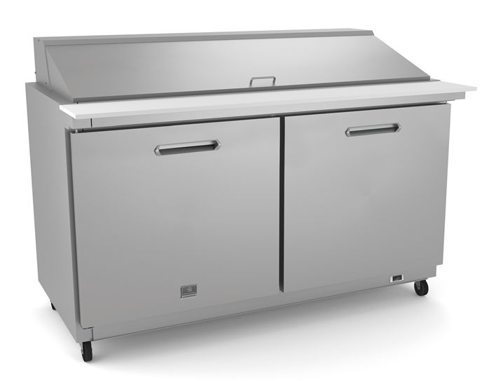 2-door mega top refrigerated preparation table. Exterior back panel in aluminum, exterior bottom panel in galvanized steel, exterior side and top panel in 430 stainless steel; interior back, top and interior bottom panels in 304 stainless steel, worktop in 430 stainless steel. Built-in refrigeration unit and an insulated lid to maintain food freshness. Fin & Tube Condenser improves performance in high temperature environments. Automatic Defrost Cooling System to provide worry-free performances.Read More