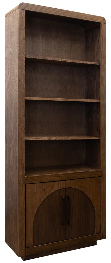 Bring Home the Eclipse 78-inch high bookcase pier for sophisticated, reimagined vintage style. Beautifully crafted from oak solids and veneers and walnut veneers, this bookshelf cabinet rests atop a crisp plinth base and features striking two-tone finish inlay arch panels on the doors that mirror the curves of the top corners.Read More
