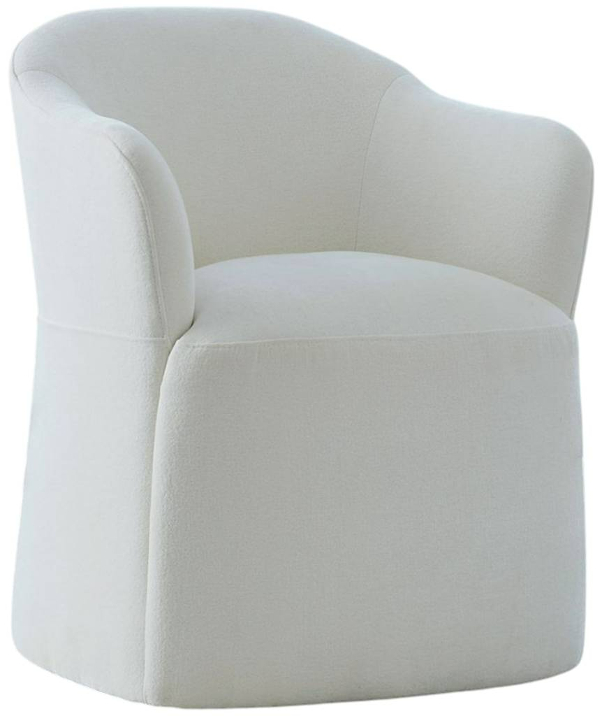 A perfect marriage of style and functionality designed to elevate your dining experience or home décor, this accent dining chair is fully upholstered in an Ivory fabric. With its gently sloping curves, arched cap rail, flared arms, and plush upholstery, this chair offers both comfort and sophistication in your style.Read More