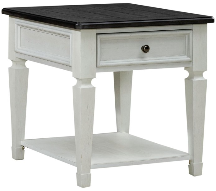 Enhance your space with the Allyson Park drawer end table. Crafted of pine solids and veneers with cathedral white oak tops, this piece features a wire brushed white finish with a planked charcoal top, one wood framed full extension drawer accented with antique pewter knob hardware.Read More