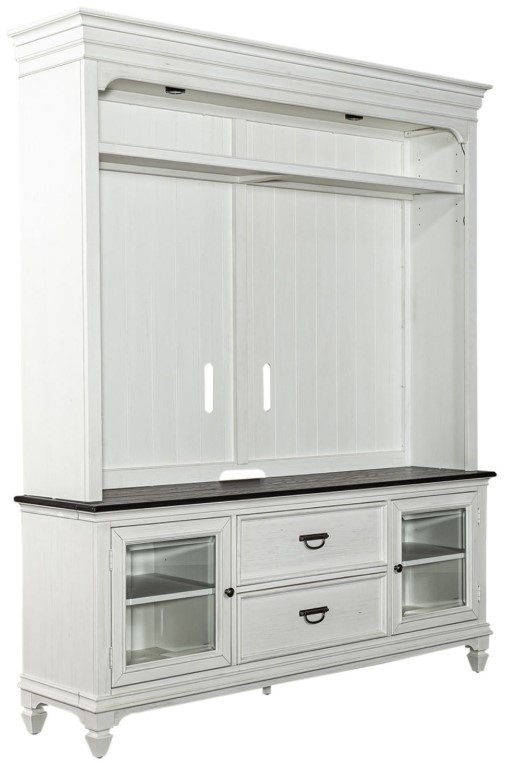 Indulge in a classic look and casual feel with the Allyson Park entertainment center. Crafted with poplar solids with cathedral white oak tops and pine veneer body, this piece features a wire brushed finish with charcoal tops, fully stained interior drawers, beveled glass doors, and touch lighting to illuminate the piece.Read More