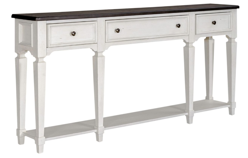 Elevate your space with the Allyson Park 72-inch hall console table. Crafted of pine solids with white oak veneers, this piece features a wirebrushed white finish with a charcoal top, three full extension drawers and a bottom shelf for additional storage.Read More