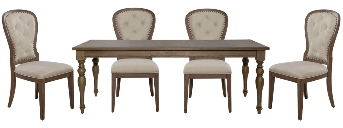 Be distinctively different with the Americana Farmhouse optional five-piece leg table set. Crafted of poplar and rubberwood solids with white oak veneers, this kit features a wire-brushed dusty taupe finish with wormhole distressing and consists of a leg table and four upholstered tufted back-side chairs.Read More