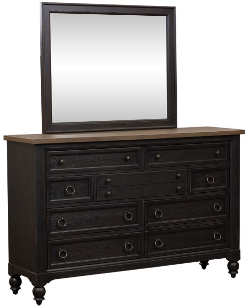 This dresser offers nine drawers of storage with a bluff-cut center drawer for added visual interest. Attach the landscape mirror with its picture frame trim and beveled edge with the included bolt-on supports. Americana Farmhouse evokes a style unconstrained and intended to be personal with an authentic craftsman's flair and artistry.