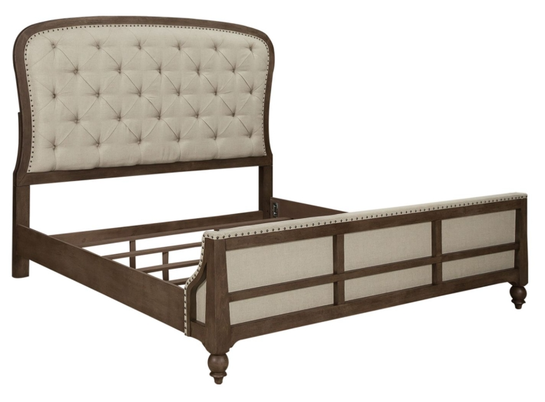 When details matter, choose the Americana Farmhouse king shelter bed. Crafted of poplar solids with white oak veneers, this bed features a wire brushed dusty taupe finish with worm hole distressing. The headboard features a softly shaped solid wood frame with a button tufted upholstered linen panel lined with nail head accents.Read More