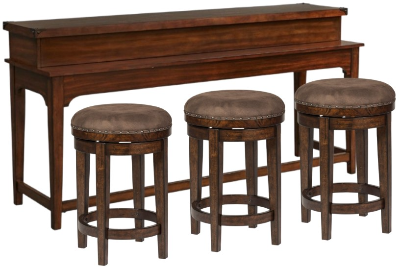 Features planked tops with metal corner accents and nail heads, cut outs beneath the top for additional storage and round swivel stools upholstered in a brown microfiber material for cleanability with accent nail heads. Perfect behind the sofa or a kitchen nook. Kit consists of one console bar table and three swivel stools.