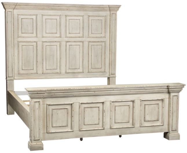 This unique panel bed is the perfect way to enhance your room with traditional living design. The white stone finish accompanied by heavy distressing creates a truly unique look. Crafted with rubberwood solids and wood products, this piece features a heavy crown molding and sturdy bolt on rails, all anchored by block feet.Read More