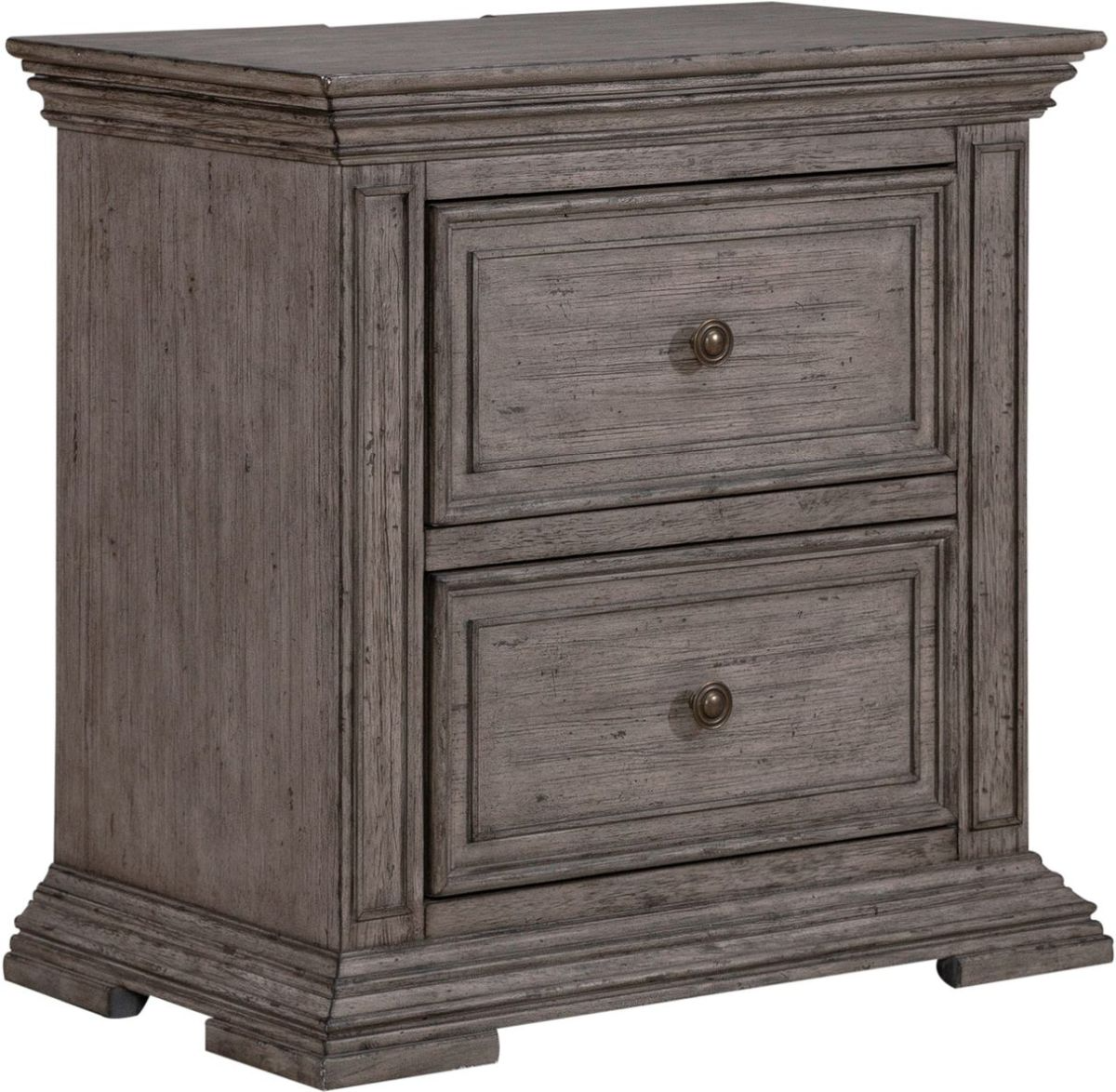 The Liberty Graystone Nightstand with Charging Station features full extension metal side drawer glides (45mm), French and English dovetail construction, and antique pewter knob hardware.Read More
