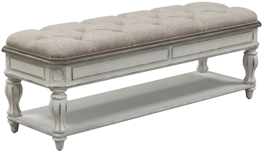 Complete your Magnolia Manor bedroom look with this bed bench. This wooden bed bench constructed with poplar solids as well as oak & birch veneers, features an antiqued white finish accompanied by heavy chipping. Relax in comfort, as the bench is upholstered beautiful ivory tweed chenille and anchored with unique faceted legsRead More