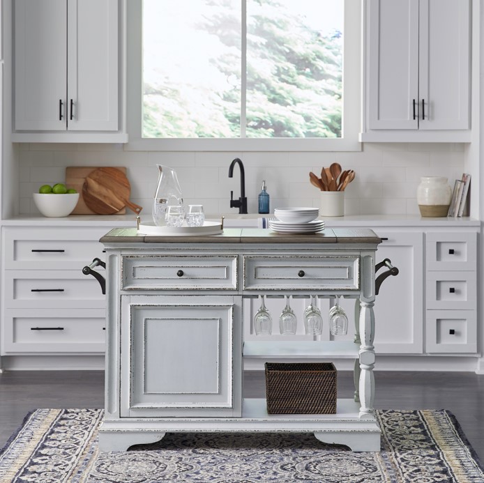 The Magnolia Manor bar cart is a stunning blend of elegance and functionality designed to elevate your entertaining space. Crafted with excellence using Rubberwood solids with White Oak and Birch veneers, this piece features an Antique White finish with a Weathered Bark finished topRead More