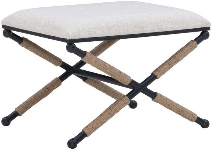 Below, the crisscross iron base in matte black is hand-wrapped in jute rope for an industrial edge with an earthy counterpoint. Place it at the foot of a bed, beside a vanity, or as extra seating in your studio—this piece will add soul and softness wherever it lands.