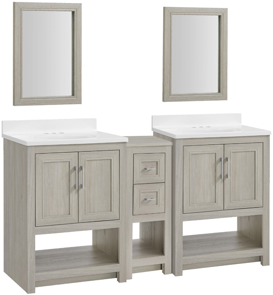 Complete Vanity Set: Includes two 18" framed mirrors, two durable white one-piece countertops with sinks, and pre-drilled holes for 4" centerset faucets (sold separately). Connect the 12" side cabinet to create a 61" wide vanity