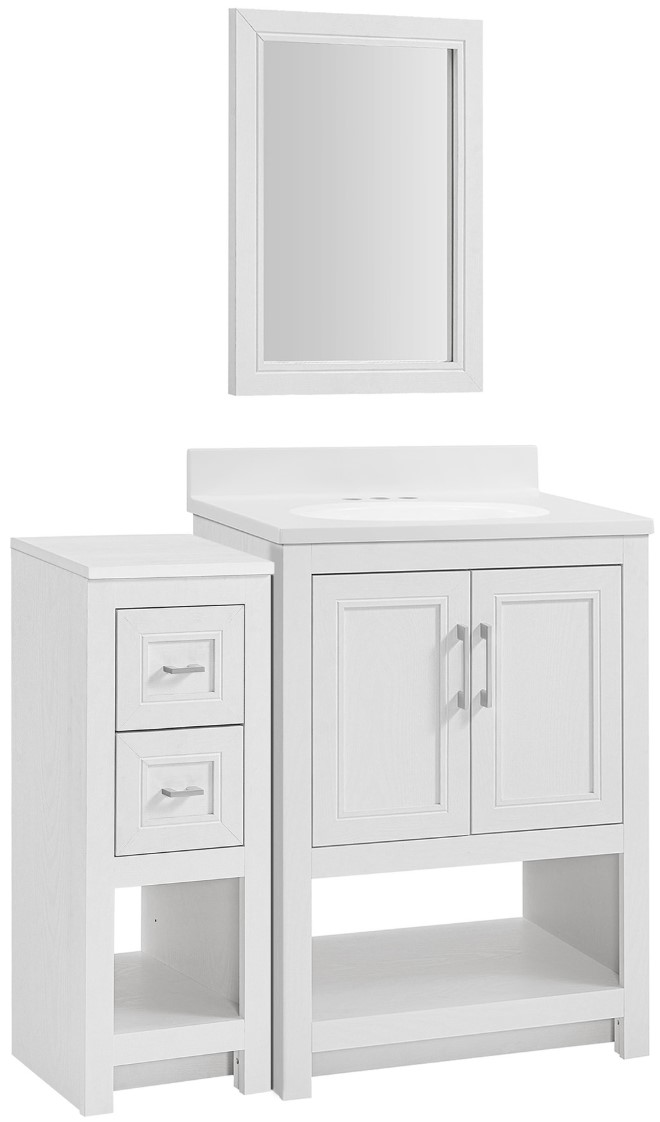 Complete Vanity Set: Includes an 18" framed mirror, a durable white one-piece countertop with sink, and pre-drilled holes for a 4" centerset faucet (sold separately). Connect the 12" side cabinet to create a 37" wide vanity