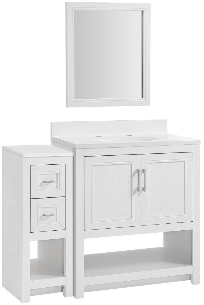 Complete Vanity Set: Includes a 24" framed mirror, a durable white one-piece countertop with sink, and pre-drilled holes for an 8" widespread faucet (sold separately). Connect the 12" side cabinet to create a 43" wide vanity
