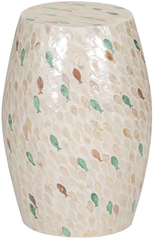 Shaped like a tapered drum and decorated with a mosaic, this accent table blends playful design with coastal-inspired elegance. The capiz shell inlay shimmers in earthy tones over an ivory base, creating a luminous finish that catches the eye.Read More