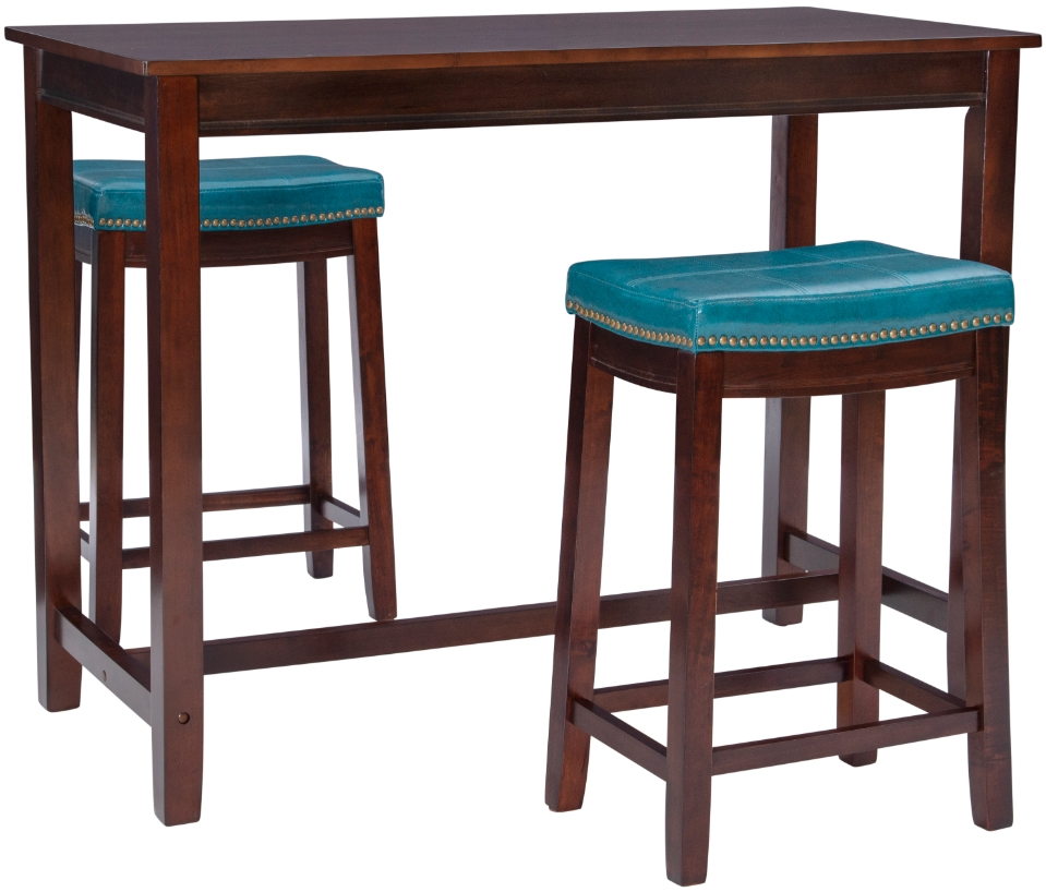 Make a bold statement with this elegant 3-piece counter set, both timeless and highly functional in tight quarters. The streamlined pub table in a rich brown stain provides a sleek and sturdy foundation, while the two matching counter stools offer a striking pop of color with their mottled blue faux leather upholstery.Read More