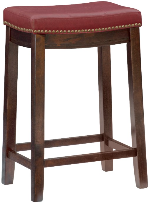 The sturdy wood frame has a dark brown finish accented by a red faux leather upholstered seat. Antique Brass nailhead trim and double needle accent stitching adds durablitly to the padded top for an eye catching detail. 26" Seat Height. 275 pound weight limit.Read More