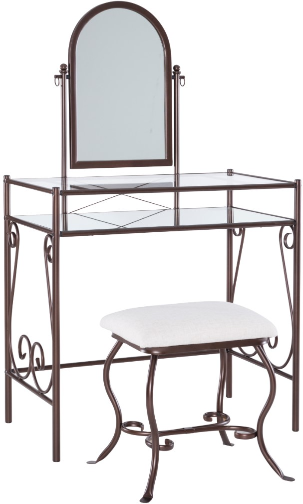 The Clarisse vanity set mixes traditional style with transitional design. A classic accent, the vanity set has a decorative metal scroll base. The mirror easily angles to best suit you. A glass top and shelf provides ample storage and display space for accessories and makeup.Read More
