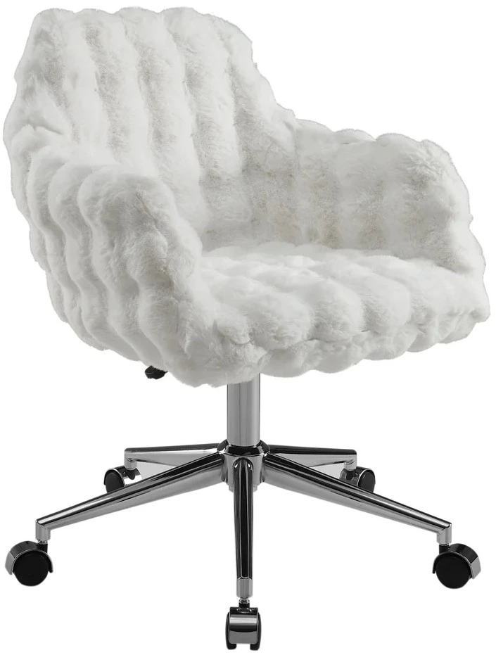 The sturdy silver chrome-finished steel base adds a sleek, modern touch, while the seat is wrapped in soft white polyester faux fur with a charming bubble pattern for added texture and personality. Adjustable height ensures customized comfort, making it perfect for long workdays or casual home use. Lightweight, functional, and irresistibly chic, this chair will transform your office into a space you’ll love spending time in. Add it to your home today!