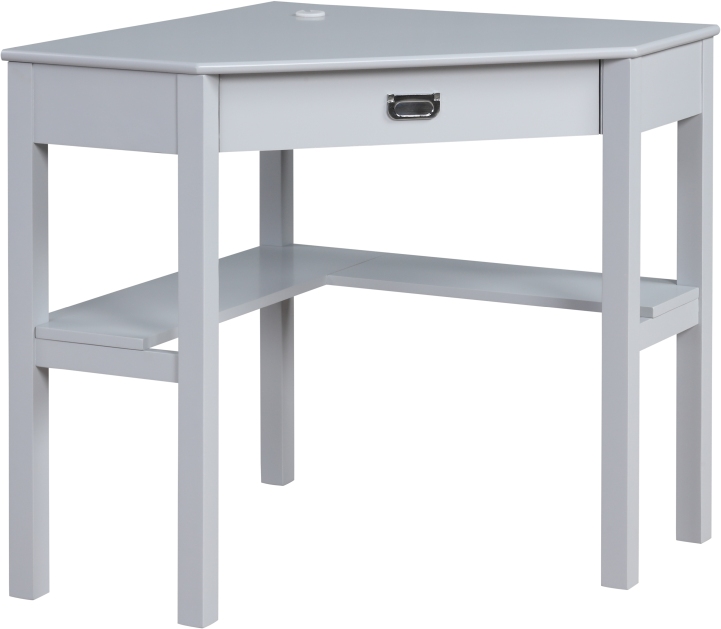 Make the most of your space with this fashionable campaign style corner desk. A modern take on a beloved classic, this unique corner desk is finished in gray and accented by a polished silver drawer pull.Read More
