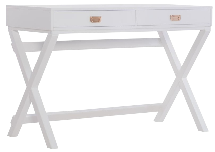 Make work fun with this campaign style writing desk. Finished in white with rose gold hardware, this desk will add color and life to any space. The x-framed legs provide a study foundation for a work space. Two drawers provide ample space for supplies.Read More