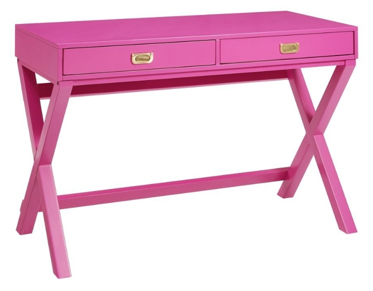 Make work fun with this campaign style writing desk. Finished in pink raspberry with rose gold hardware, this desk will add color and life to any space. The x-framed legs provide a study foundation for a work space. Two drawers provide ample space for supplies.Read More