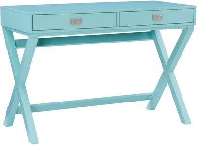 Make work fun with this campaign-style writing desk. Finished in bright blue with silver hardware, this desk will add color and life to any space. The x-framed legs provide a sturdy foundation for a workspace. Two drawers provide ample space for supplies.Read More