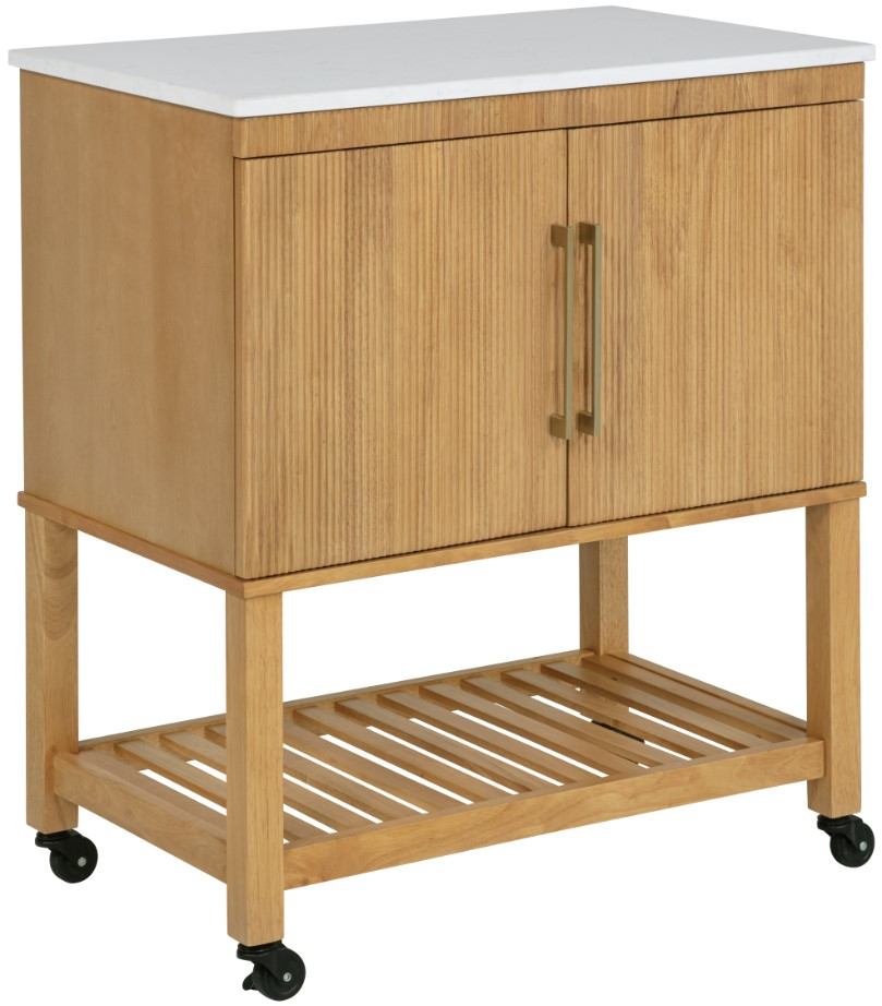 The white granite stone top offers a robust and stylish workspace with a 100lb weight capacity, perfect for food preparation or display. Gold-plated steel handles add a touch of elegance, while the front’s reeded texture introduces a unique design element. With a spacious interior featuring a shelf and bottom shelf, plus a lower slatted shelf for open storage, this cart effortlessly blends rustic charm with practical utility, making it an ideal fit for any home. Please note: Use a cutting board or other food-safe surface when preparing meals on the countertop for food safety.