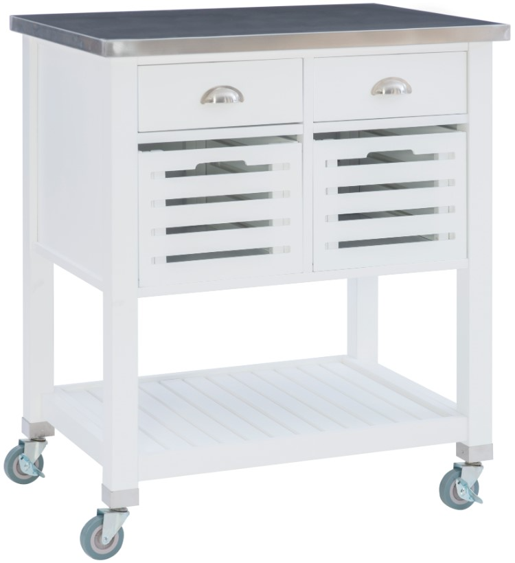 Plus, you can keep produce fresh in two Faux Leatherll out bins with slats for air circulation. This charming cart, finished in warm gray or white with stainless steel drawer pulls, will complement any interior.