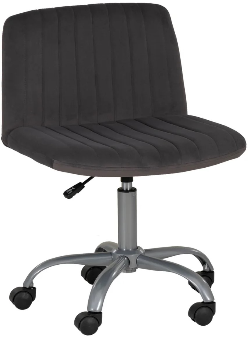 Elevate your workspace with this stylish grey adjustable rolling office chair. Upholstered in soft polyester fabric with a chic channeled stitching design, it offers both comfort and modern flair. The adjustable height (30-34.75 H) ensures you find your perfect seating position, while the smooth-rolling chrome base provides mobility and support.Read More