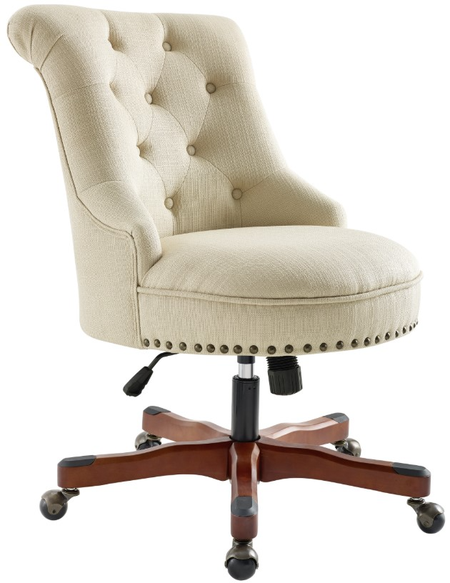 Add style and function to your office with the Sinclair Office Chair. The soft, plush frame features a button tufted back and is upholstered in a beige rice fabric. Burnished brass nailheads adds eyecatching interest to the chair. A cherry wood base has metal casters for ease of mobility.Read More