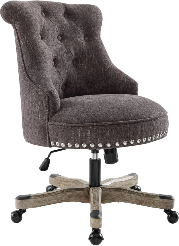 Add style and function to your office with this office chair. The soft, plush frame features a button tufted back and is upholstered in an aqua fabric. Silver or antique bronze nail heads accent the chair. A dark walnut wood or light grey base has metal casters for ease of mobility.Read More