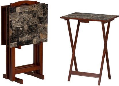 Upgrade your living space with this stylish and functional 5-Piece Folding TV Tray Table Set. Featuring a sleek faux marble top and a sturdy espresso or black wood base, these trays add a touch of modern elegance to any home.Read More