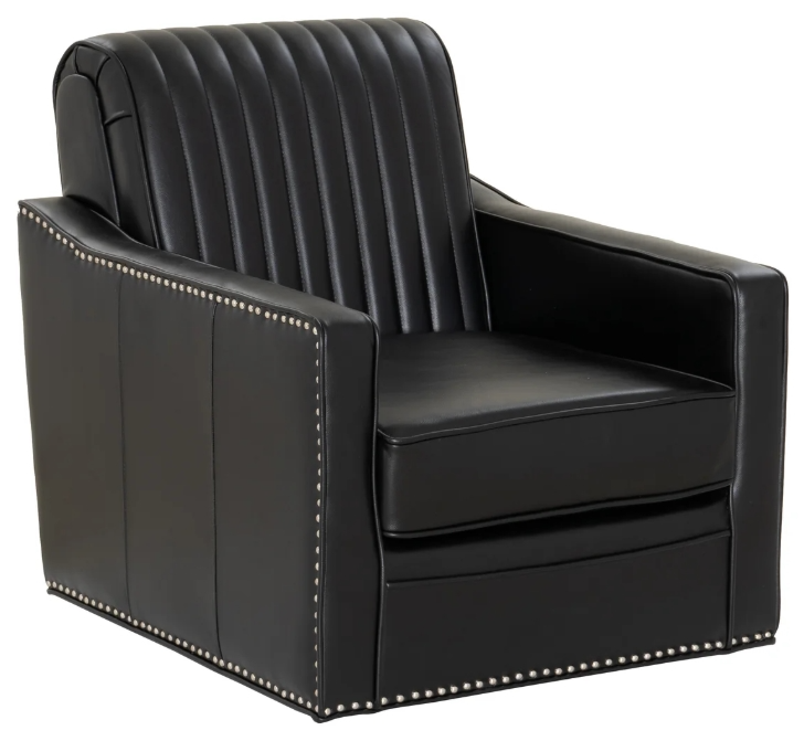 Command attention and unwind in style with this sleek swivel accent chair. Wrapped in supple faux leather and finished with nickel nailhead trim, it pairs modern sophistication with everyday comfort. A smooth 360° swivel base and contoured channel-tufted backrest deliver both elegance and function.Read More