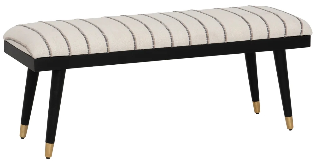 Make a bold yet elegant statement with this upholstered bench—perfect for styling at the end of a bed, in a hallway, or as extra living room seating. Crafted with a sturdy mango wood frame in a painted black finish, the bench is topped with a cream and black woven cotton upholstery and elegantly cushioned.Read More