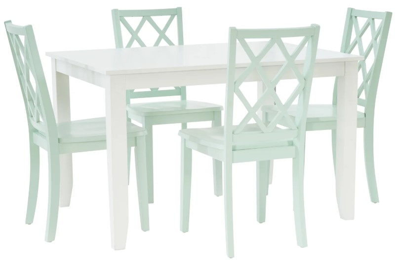 Create a charming, welcoming atmosphere in your dining space with this elegant 5-piece set. Featuring a sturdy rectangular table in faux leather white, this set is accented by 4 chairs in a striking graphite, gray, mint, white or multi-colored finish, offering a bold yet sophisticated contrast.Read More