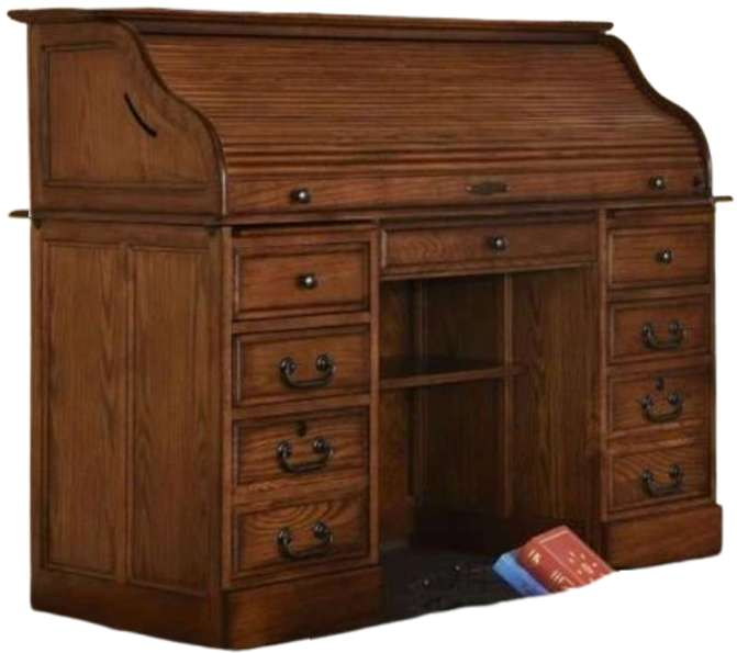 Hutch top features solid oak roll down tambour full canvas underneath with key lock electric plug and USB ports built into desktop writing surface for easy access. Mail sorting slot and eight small drawers with label placement slot.Read More