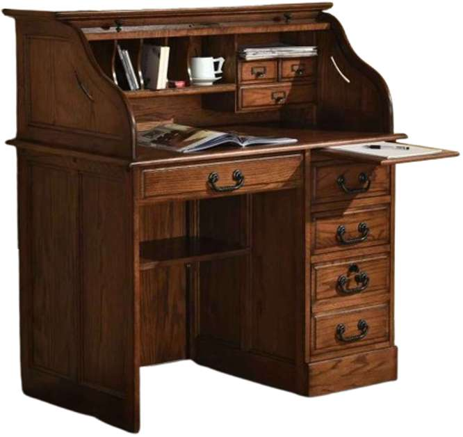 Hutch top features solid oak roll down tambour full canvas underneath with key lock electric plug and USB ports built into desktop writing surface for easy access. Mail sorting slot and three small drawers with label placement .Read More